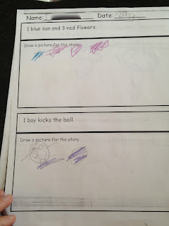 The highest level worksheets consist of reading a sentence and then drawing (as well as coloring) a picture to match the sentence.